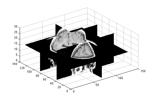 and reshape first.D = double(D);D = reshape(D,128,128,27);slice(D,70,[40 85],17)shading flatview(-37,45)